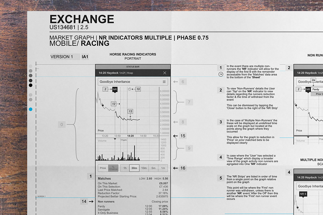 IA research translated into flows & layouts were used to realised the tool, as a ‘runners sheet’ of information with features to allow ‘Pro Bettors’ to analyse, compare & leverage runner price changes on the go and introduce ‘Gamblers’ to the Exchange idea of informed betting & trading.
