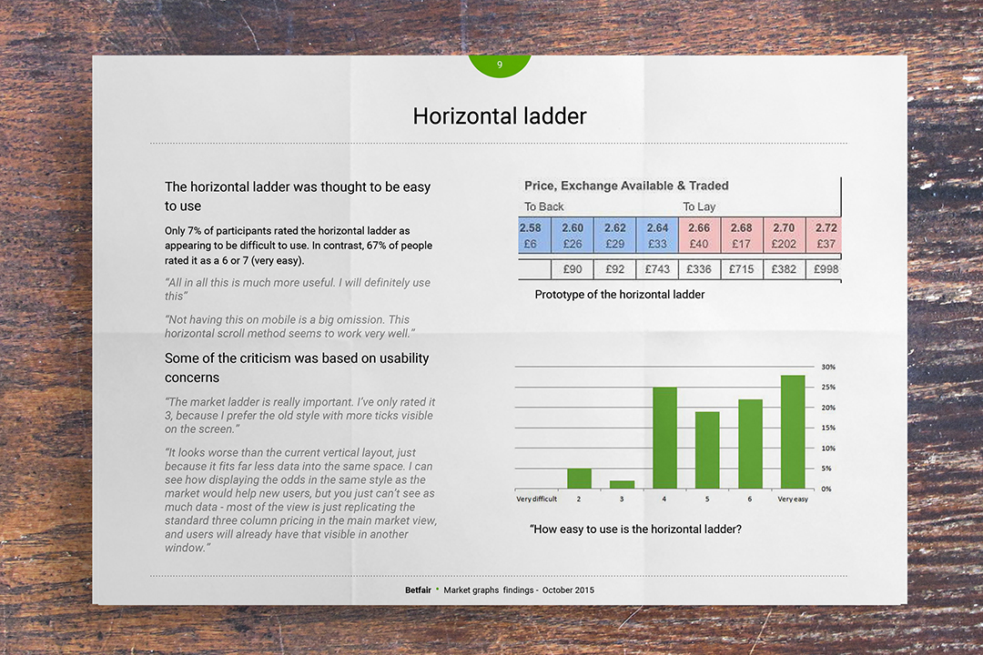 “It looks worse than the current vertical layout, just because it fits far less data into the same space. I can see how displaying the odds in the same style as the market would help new users, but you just can't see as much data - most of the view is just replicating the standard three column pricing in the main market view, and users will already have that visible in another window.” Customer survey feedback