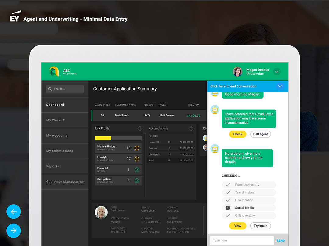 An AI will assist customers through 'Facial Recognition' for easy identification & validation of application while helping the Agent through automating the sourcing of a compatible Underwriter that can meet the needs of their customers.